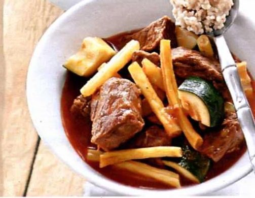 2. Мясо обжарить на растительном масле на сильном огне. Посыпать мукой, подмешать томат-пасту. Тушить мясо ок.10мин. Влить вино, добавить цуккини и фасоль. Влить бульон, посолить и поперчить. Готовить на умеренном огне 15мин. В перловую кашу подмешать сливочное масло. Гуляш посолить и поперчить по вкусу и подать с кашей.